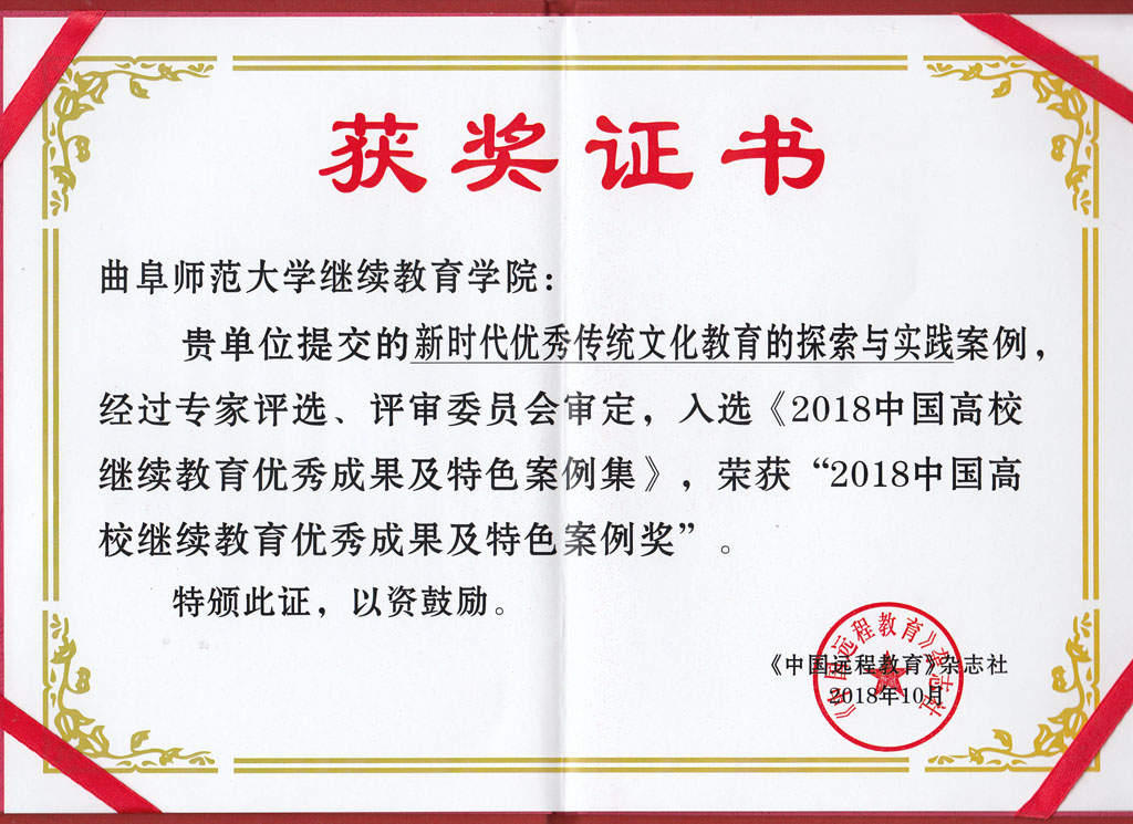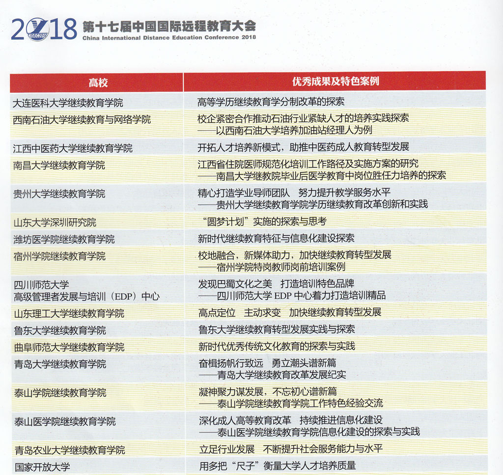 报送的《新时代优秀传统文化教育的探索与实践》榜上有名。据悉,获奖的成果及案例将陆续宣传展示,并编辑出版《2018中国高校继续教育优秀成果及特色案例集》。优秀成果及特色案例将报送教育行政部门领导、行业协会负责人、高校负责人及媒体代表参阅。