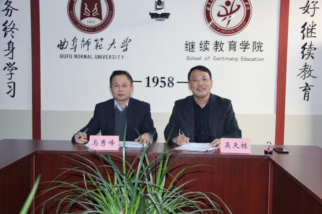 与济南现代职业技能培训中心签订非学历继续教育合作协议共同开展计算机等级考试辅导培训,院长马秀峰、副院长邢春雷、自考培训部部长杨来舜,济南现代职业技能培训中心校长吴天栋参加签约仪式。