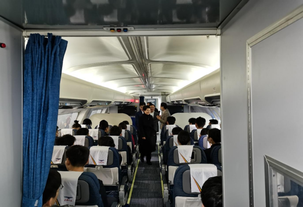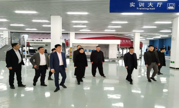 在中航未来科技股份有限公司总裁刘尹、副总裁庞庆国、开发总监黄小勇的热情接待与陪同下,茌淑君等四人首先参观了学生公寓、食堂、运动场等配套设施;随后来到实训厅,考察了机场实训模拟大厅、客舱模拟训练舱、应急训练舱、舱门训练器以及医疗室、茶艺室、化妆室、形体室等专业教室。