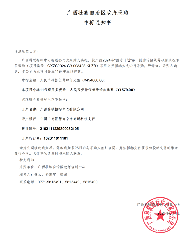 2024年6月1日,中国政府采购网及中国政府购买服务信息平台正式公布了《广西科联招标中心有限公司关于广西2024年“国培计划”第一批自治区统筹项目承担单位遴选(GXZC2024-G3-003408-KLZB)中标结果公告》,体球网成功中标第11号分标——广西农村骨干教师培训(初中地理)。