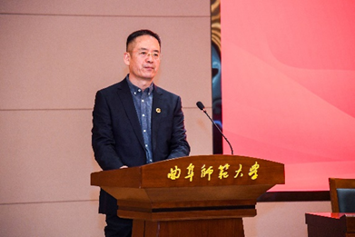 在校歌声中,刘刚为6名新生代表佩戴校徽,象征他们正式成为了曲阜师范大学大家庭的一员。