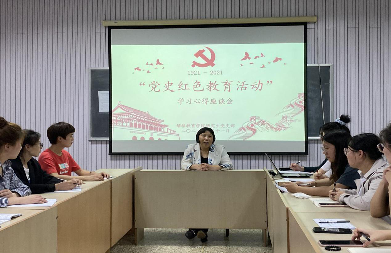 研究生党支部于5月11日晚召开了“党史红色教育活动”学习心得座谈会。座谈会由职业与继续教育研究院院长何爱霞主持,共15位研究生党员和入党积极分子参加了会议。