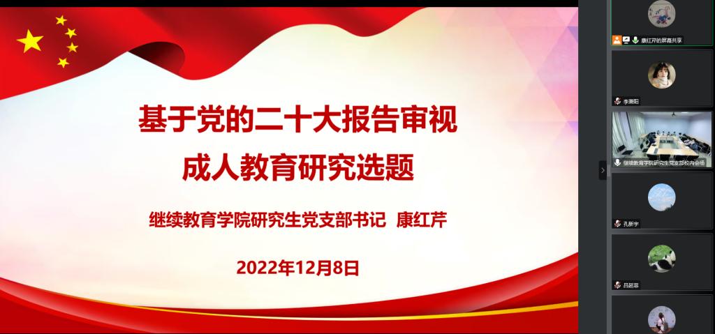 研究生党支部书记康红芹以“基于党的二十大报告审视成人教育研究选题”为题,为体球网