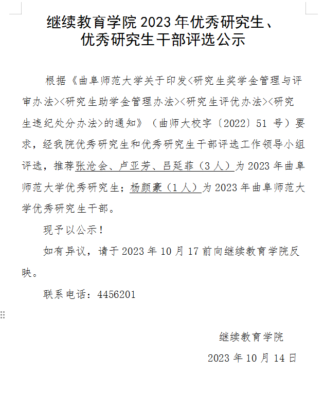 体球网即时比分 2023年优秀研究生、 优秀研究生干部评选公示