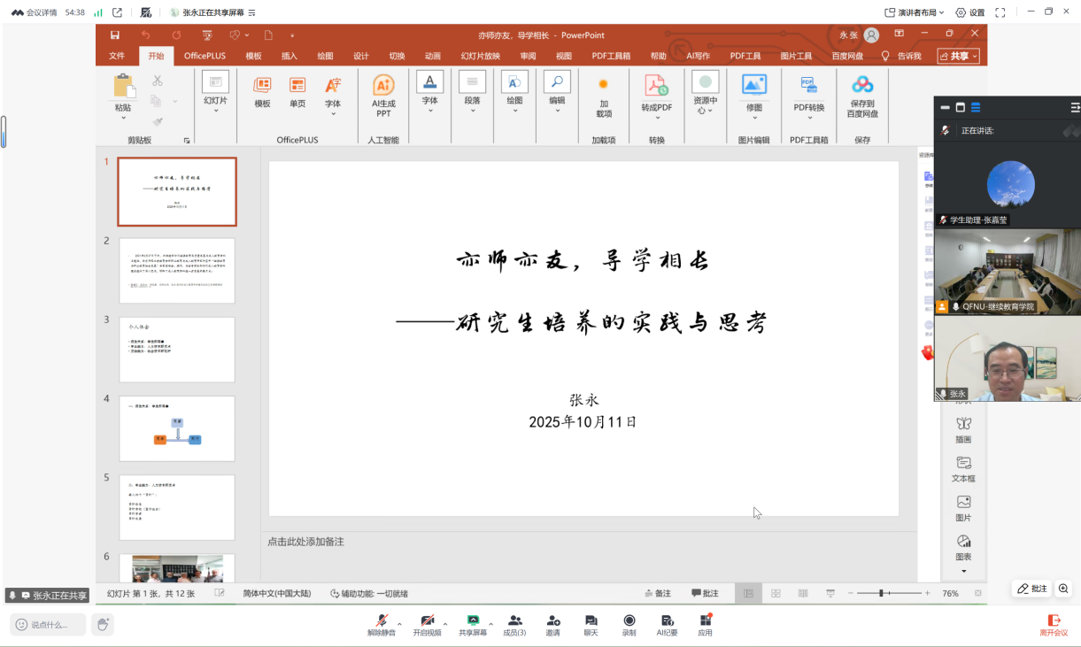 邀请华东师范大学教育学部职业教育与成人教育研究所副所长、博士生导师张永教授线上作了题为《亦师亦友,导学相长——研究生培养的实践与思考》学术讲座,会议由何爱霞教授主持。