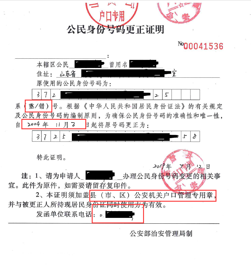 (3)前置学历身份证号与现在所持证件不一致的,除提供(1)(2)项材料外,还需提供:本人手写身份证号变更的说明、专科档案材料、公民身份号码更正证明的扫描件。公民身份号码更正证明如图所示: